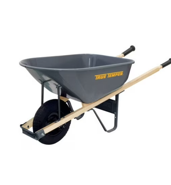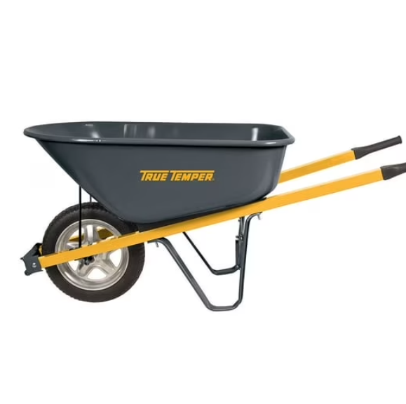 Get more done with this hard-working True Temper wheelbarrow. The spacious 6 cu. ft. steel tray, rugged steel handles and flat-free tire make this unit ideal for just about any job. Use it to haul stone, gravel, dirt, pine straw, mulch, firewood and more. This wheelbarrow is sturdily built and designed to provide years of dependable service.